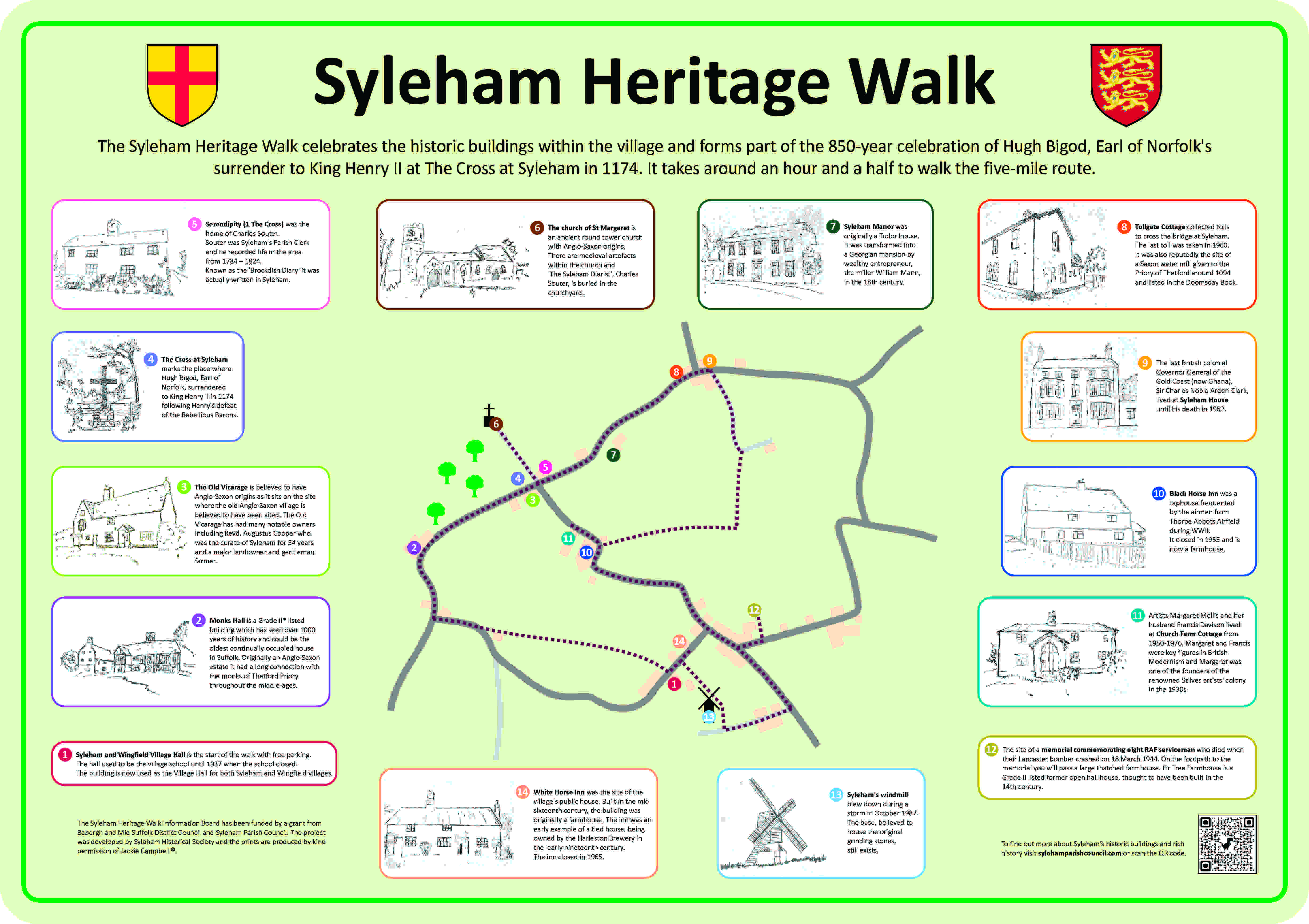 The Syleham Heritage Walk celebrates the historic buildings within the village and forms part of the 850-year celebration of Earl Bigod’s surrender to King Henry II at Syleham in 1174. The walk takes around an hour and half to walk the five mile route.